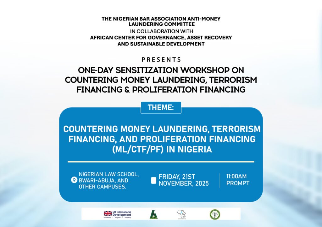 The Nigerian Bar Association Anti-Money Laundering Committee (NBA-AMLC), in collaboration with the African Center for Governance, Asset Recovery and Sustainable Development, is set to host a one-day sensitization workshop aimed at strengthening Anti-Money Laundering, Countering the Financing of Terrorism, and Proliferation Financing (AML/CFT/PF), and professional ethics awareness among Nigeria’s next generation of lawyers.
